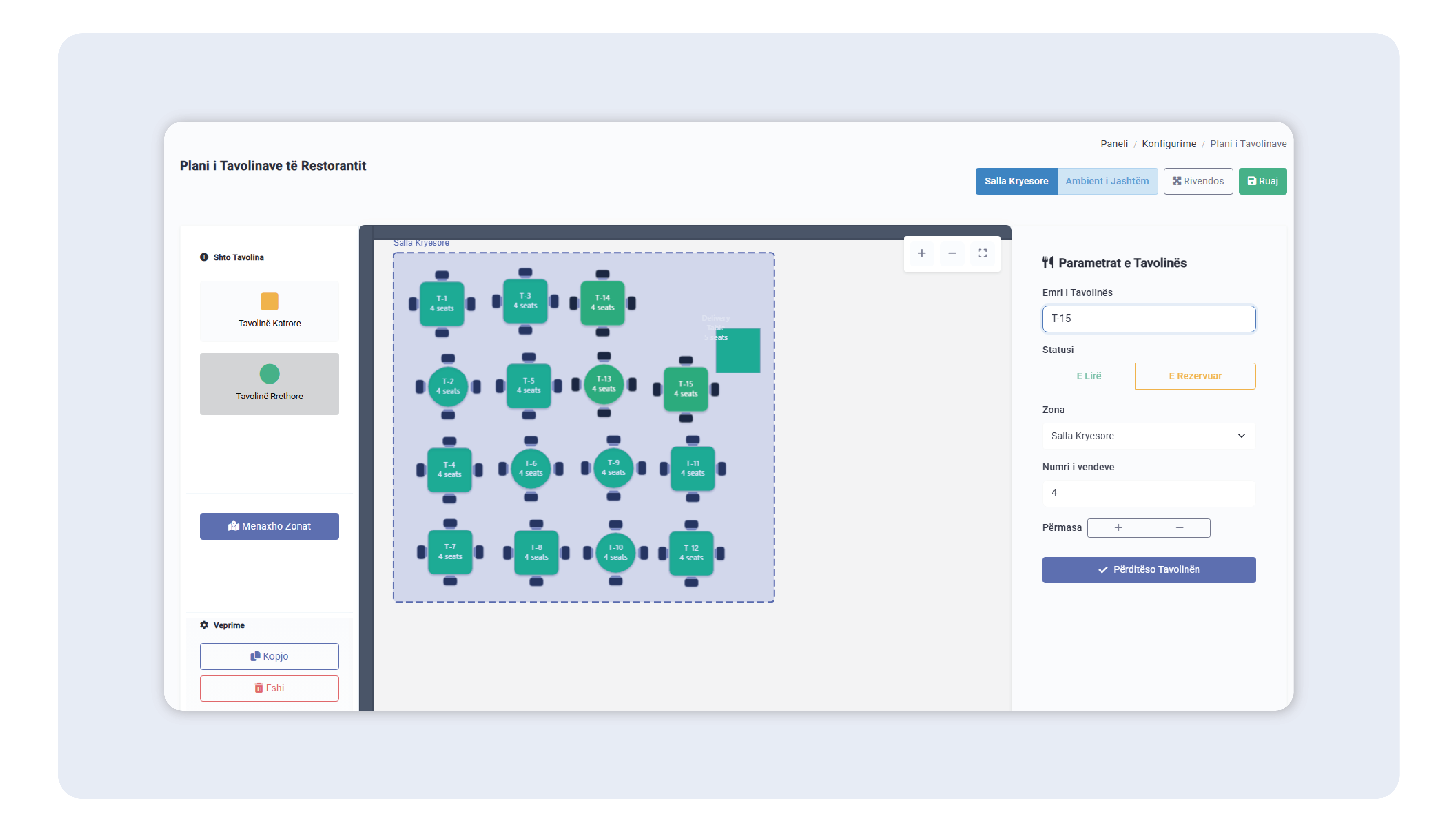 Pasi krijoni një zonë biznesi, ju keni mundësinë të shtoni pa kufizim zona të reja dhe më pas të vendosni tavolinat në planin e restorantit sipas koordinatave që dëshironi. Çdo ndryshim ruhet automatikisht, duke ju kursyer kohë dhe duke thjeshtësuar organizimin.